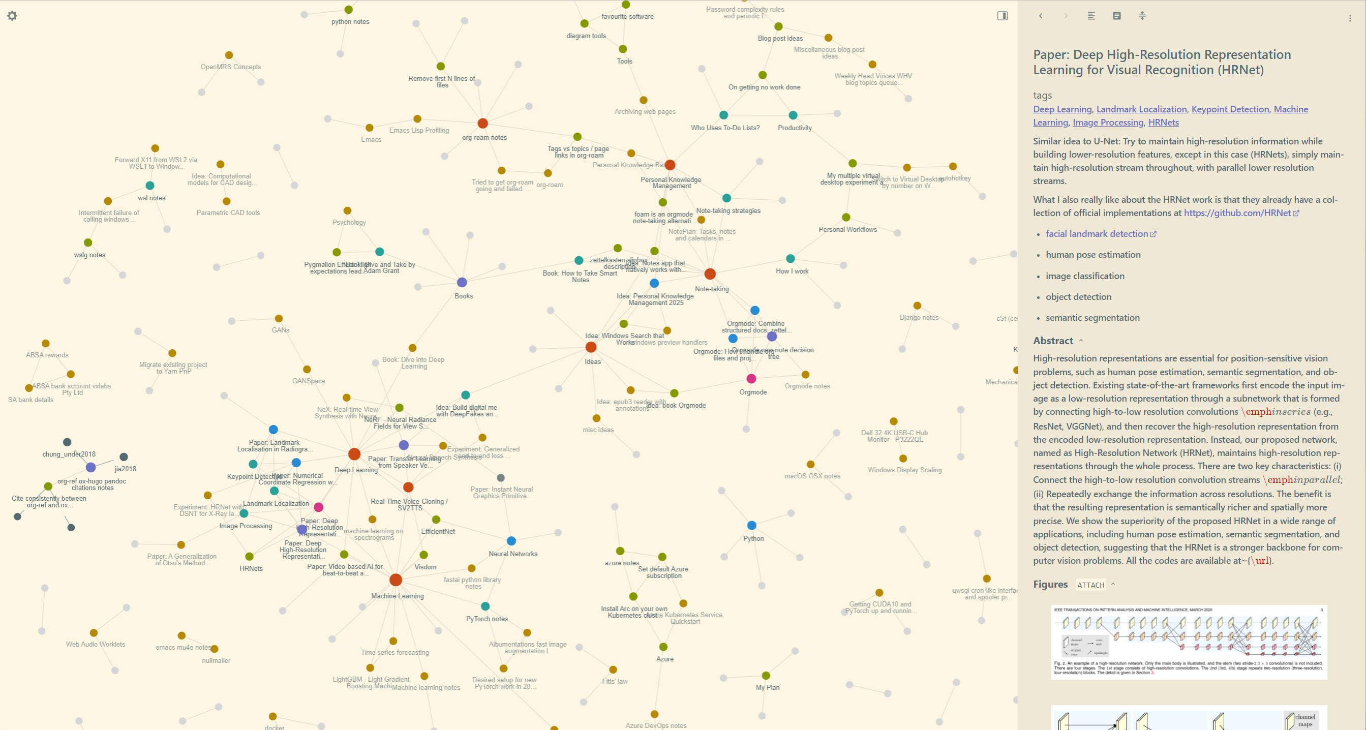 - consisting of hundreds of interlinked notes about people, things and tricks. Thanks to the magic of org roam, notes can live as files or as headings in a month or project file.