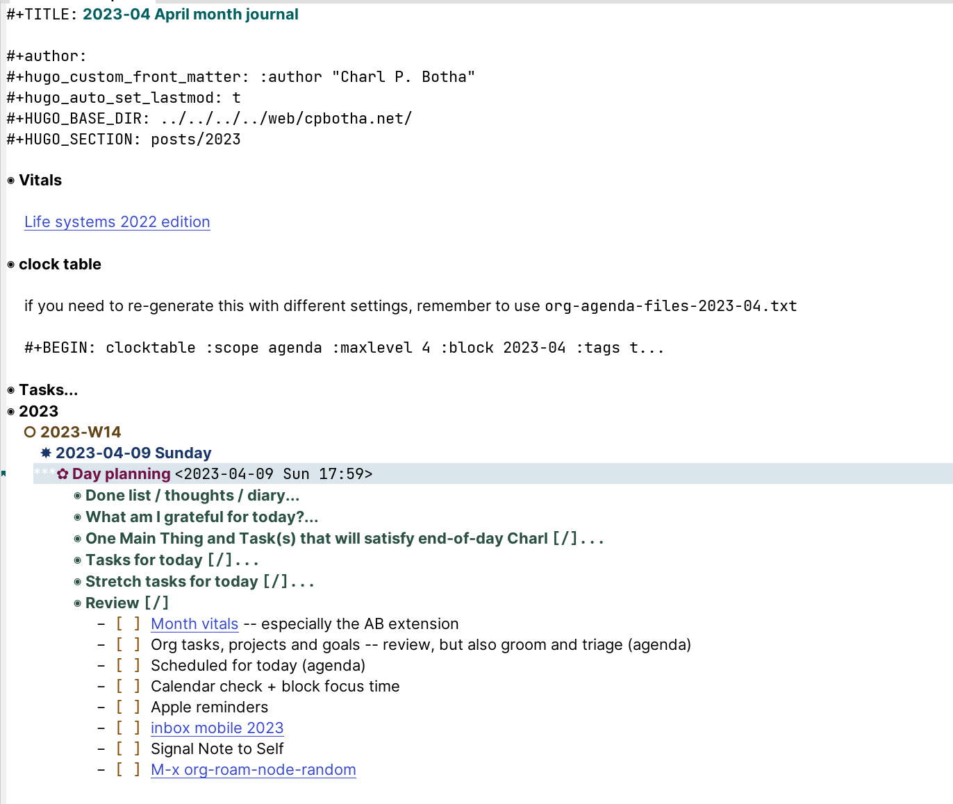 Aside from the Hugo properties which mean I’m ready to publish any heading as a blog post (this is usually how WHVs are done), my Life Systems 2022 aka personal philosophy reminder, and the clock table where I get a complete break-down of all work-time spent, I would like to mention the following two aspects of the month journal.