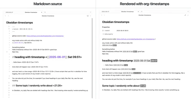 Long story short, I could not resist for much longer, and so I hacked together a new Obsidian plugin called Org timestamps.